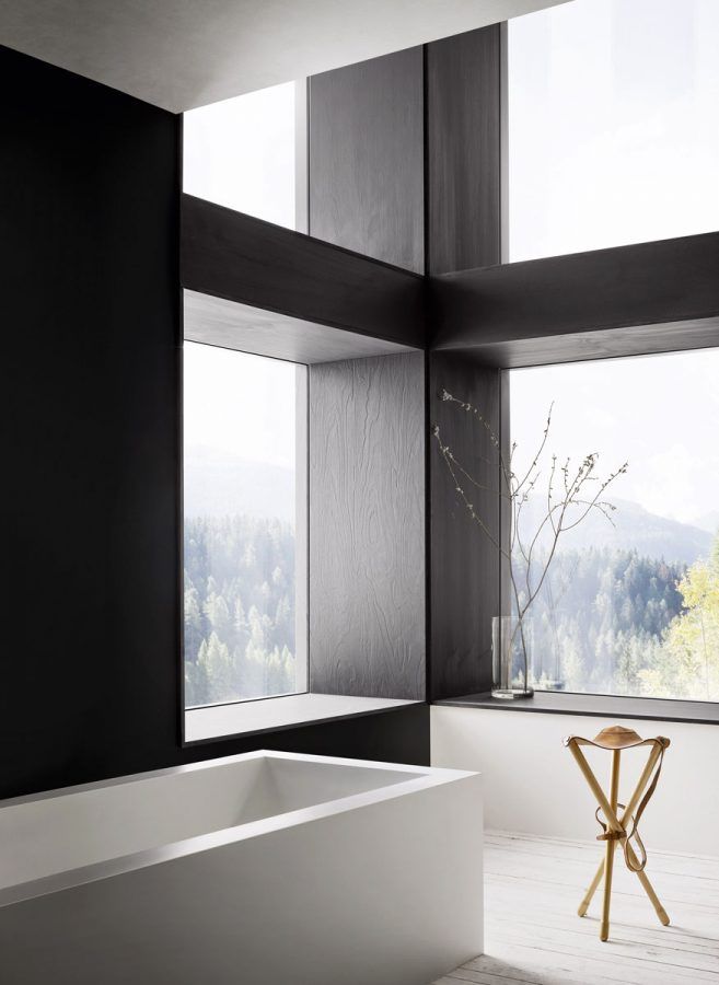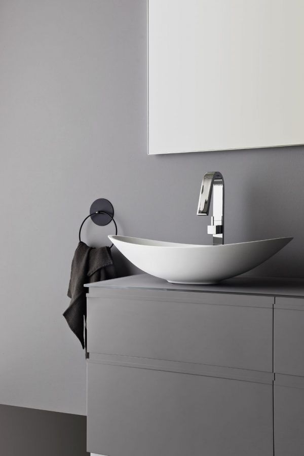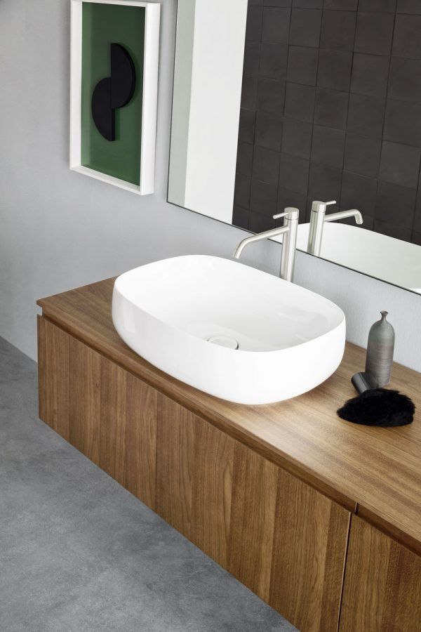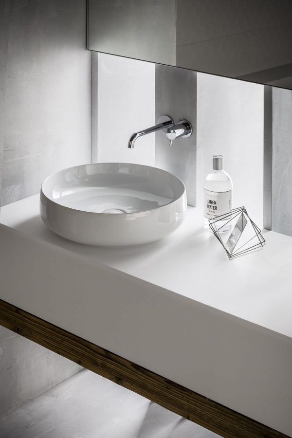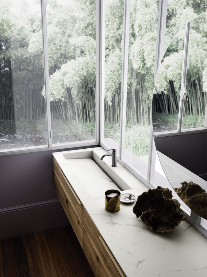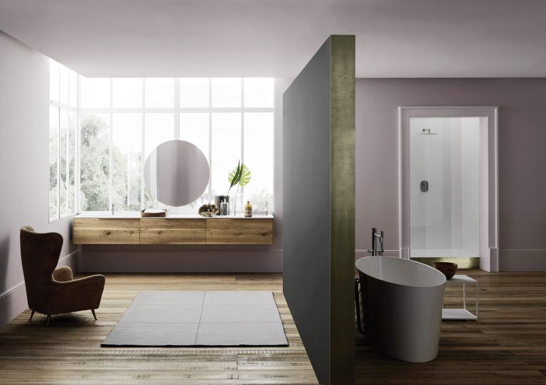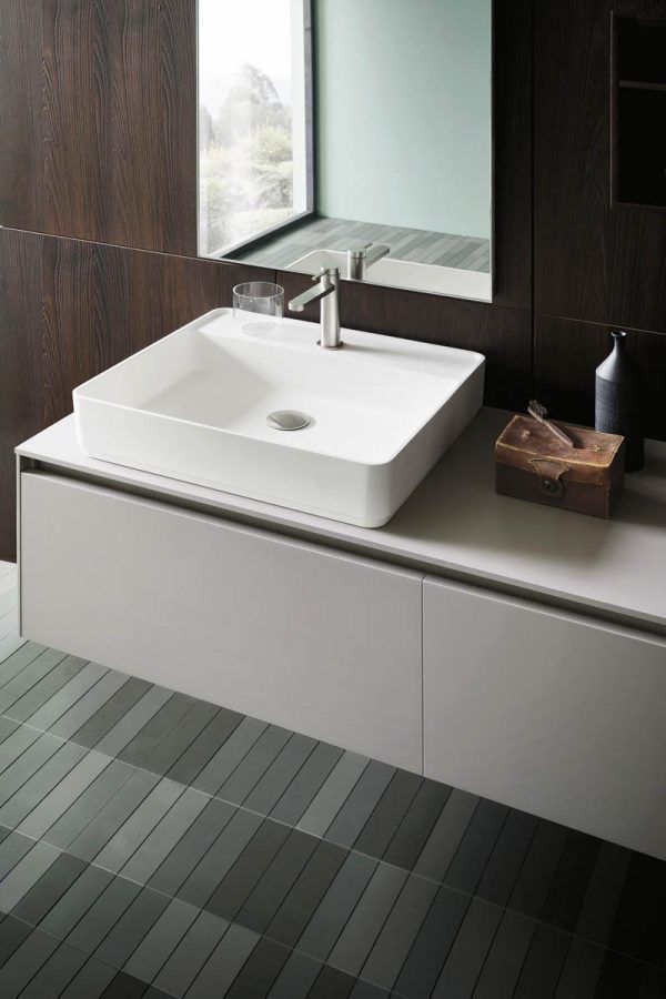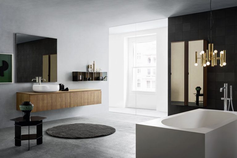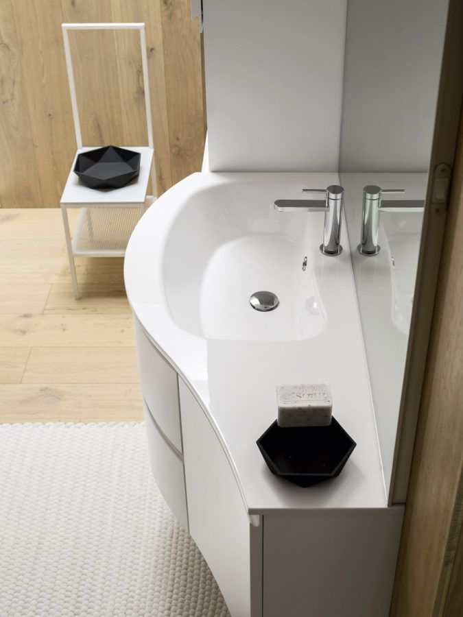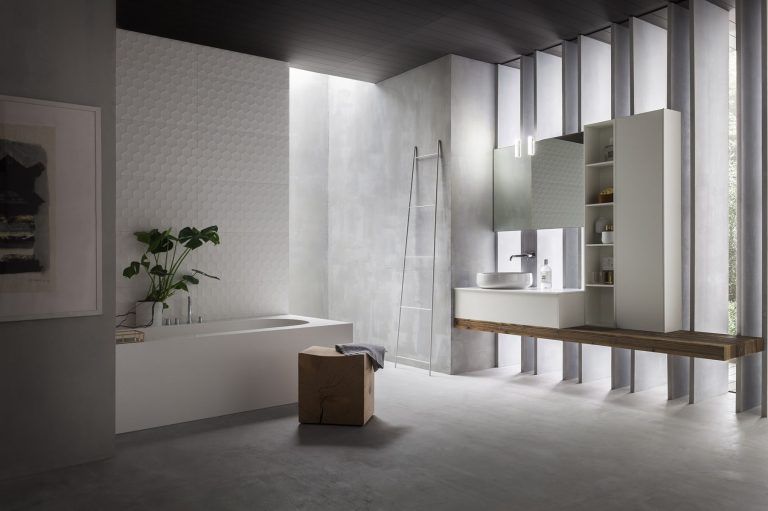 Mobilier de salle de bain conçu comme un jeu de formes et de matériaux