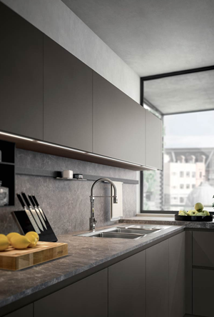 Un modèle innovant qui offre des combinaisons modernes de lignes droites, de nouveaux matériaux et des configurations évocatrices de l'environnement. Des solutions harmonieuses caractérisées par une attention particulière aux détails qui sont racontés dans le profil de la porte de 22 mm d'épaisseur formée à 33 ° et qui n'oublient jamais la dimension fonctionnelle et la vie quotidienne. Une cuisine qui parvient à s'adapter aux nouveaux rythmes de la vie quotidienne et à satisfaire les envies de personnalisation.
